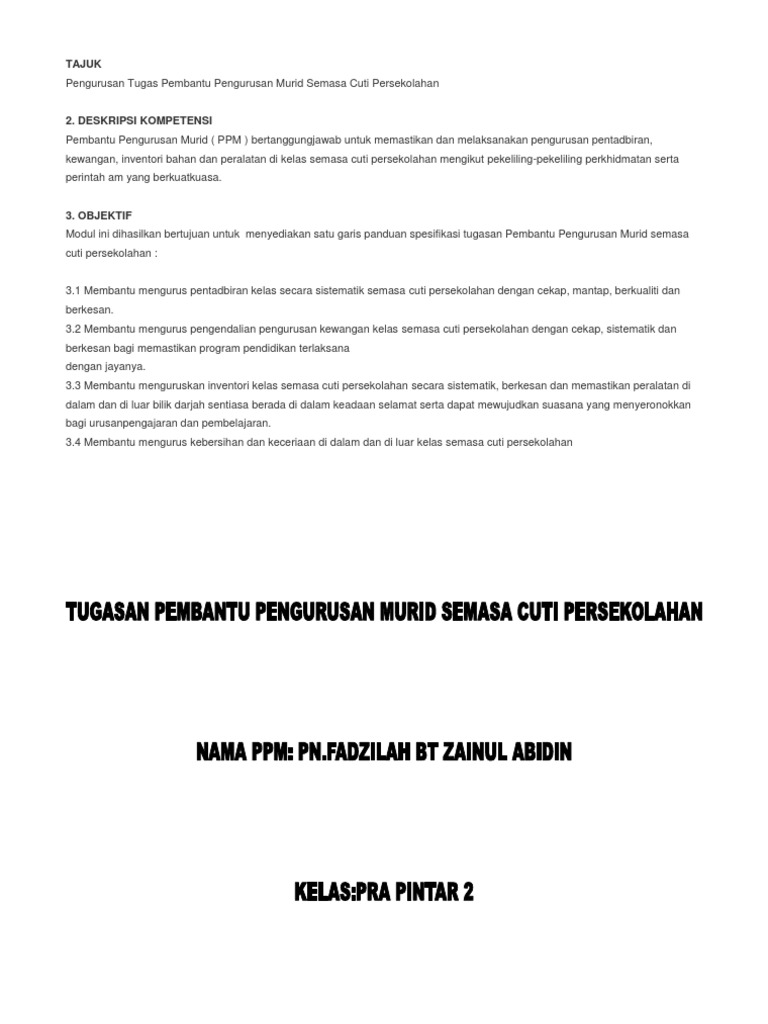 Tugasan Pembantu Pengurusan Murid Semasa Cuti Sekolah Pdf
